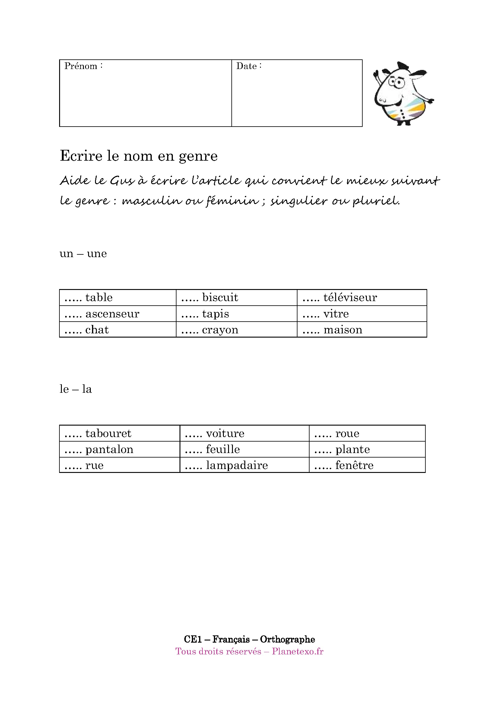 Aide le Gus à écrire l’article qui convient le mieux suivant le genre : masculin ou féminin ; singulier ou pluriel.