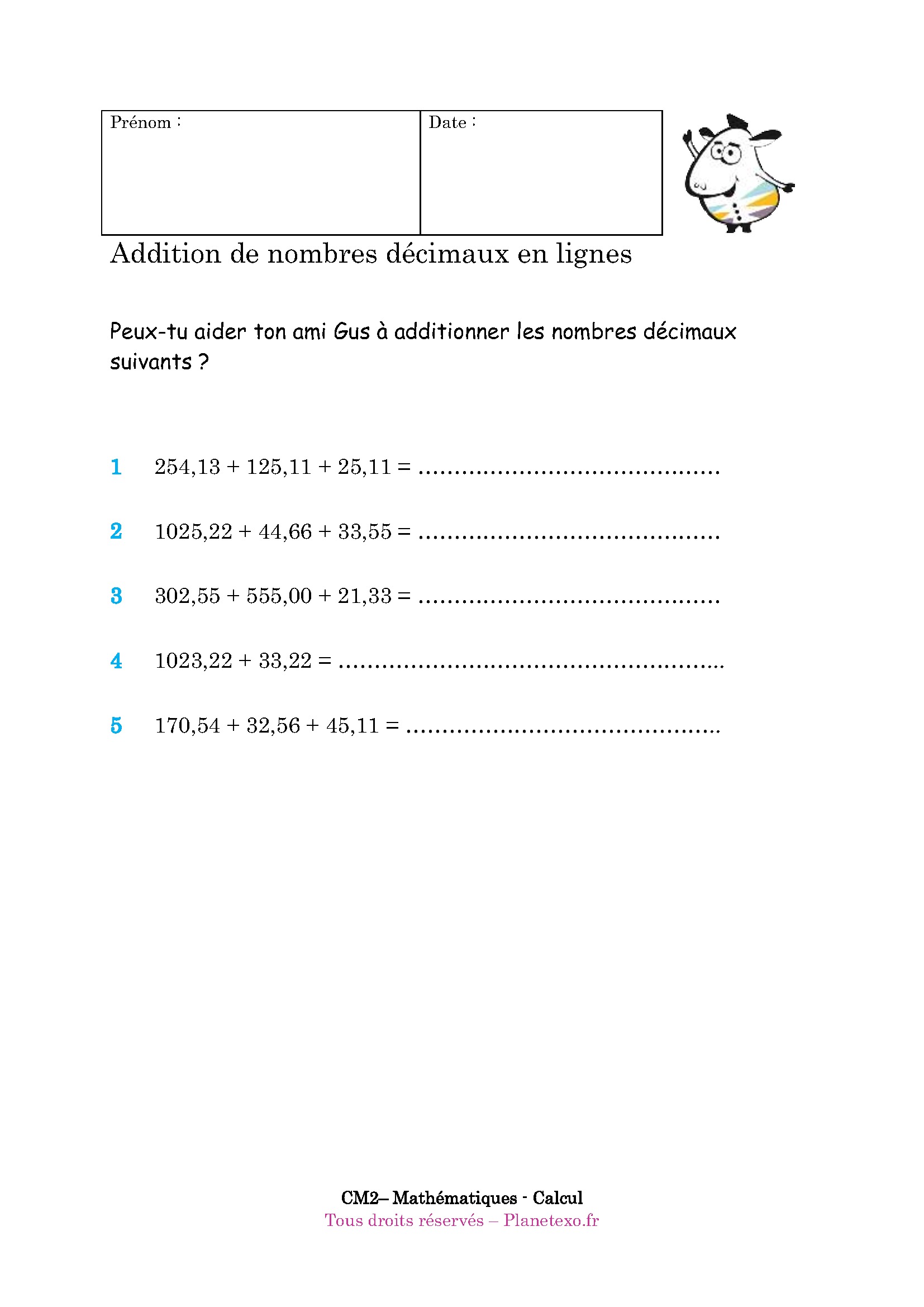 Peux-tu aider ton ami Gus à additionner les nombres décimaux suivants ?
